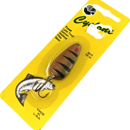 Ця класична блешня вагою 1/4 унції (7 г) має глибоке тиснення у вигляді луски, що створює гру світла, відмінну від приманок із пласкою поверхнею. Забарвлення Bronze Perch на цій моделі довжиною 1 3/4" (4,5 см) — це традиційна палітра, де тепла металева основа поєднується з темними вертикальними смугами та червоною цяткою біля голови. Приманка з артикулом 14623 постачається в оригінальному жовтому пакуванні та не була у використанні. Виготовлена компанією Thomas Spinning Lures, Inc. у Гоулі, штат Пенсильванія, модель Cyclone залишається фаворитом для лову форелі, судака та щуки ще з середини XX століття. Вигнутий профіль блешні розроблений для закидання та тролінгу, а гострий заводський трійник надійно зафіксований на міцному заводному кільці.