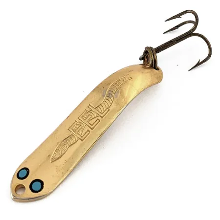 На зворотному боці вигравірувано маркування моделі R323 та фірмовий логотип Thomas із зображенням орла, що підтверджує автентичність цієї 4-грамової блешні, виготовленої в США. При довжині 4,5 см золотисте тіло приманки має глибоке тиснення з написом «EEL», переплетеним зі змієподібним візерунком на лицьовому боці. Відразу над отвором для кріплення жилки розташовані дві чіткі блакитні цятки, що імітують очі та створюють яскравий акцент на блискучому металевому покритті. Оснащення включає міцне заводне кільце та гострий трійник із темним покриттям, обидва елементи перебувають у відмінному стані. Стан цього екземпляра оцінюється на 5/5: чиста дзеркальна поверхня відповідає вимогам до добре збереженої колекційної речі. Розроблена для ловлі в закид або тролінгом, блешня Thomas EEL завдяки своєму вузькому профілю та корпусу зі штампованої латуні є класичним інструментом для риболовлі на форель та окуня; артикул моделі — 15254.