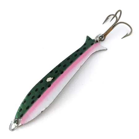 Штампований металевий корпус цієї приманки завдовжки 6,5 см (2 1/2") має деталізоване забарвлення під райдужну форель, нанесене на поліровану сріблясту основу. Розроблена переважно для тролінгу, ця блешня Thomas Speedy Shiner (артикул 14383) важить 5 г (3/16 унції) та має вузький профіль, що імітує малька. Забарвлення лицьового боку вирізняється темно-зеленою спинкою з чорними цятками, чіткою рожевою бічною смугою та білим черевцем. На звороті на сріблястому металі чітко викарбувані фірмові штампи виробника, вага та логотип із зображенням орла. Цей екземпляр перебуває у відмінному стані (5/5), лакофарбове покриття та фурнітура добре збережені. Блешня оснащена оригінальними заводними кільцями та гострим трійником, що відповідає стандартам якості приманок Thomas американського виробництва, призначених для лову форелі та лососевих видів риб.