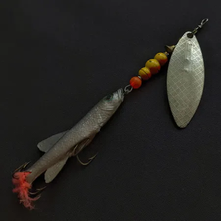 Маючи загальну довжину 10 см (4 дюйми), ця гібридна вертушка представляє особливу епоху майстерності Mepps, коли французькі комплектуючі поєднувалися з американською збіркою. Срібляста пелюстка форми «вербовий листок» 3-го номера має тиснення у вигляді ромбовидної сітки на лицьовій стороні та чітке маркування «Made in France» на звороті. За хомутиком пелюстки розташовано п'ять намистин — одну помаранчеву та чотири жовті, що забезпечують візуальний перехід до м’якого силіконового трейлера Mino. Цей екземпляр вагою 14 г (1/2 унції), що йде під артикулом 21023, оснащений трійником, який виходить із реалістичного сріблястого тіла рибки, доповненого невеликим пучком червоних волокон у хвості. Стан приманки 4/5, при цьому силікон залишається надзвичайно еластичним, а металеві компоненти зберегли яскравий блиск. Розрахована переважно на ловлю в закид або тролінг, вага приманки дозволяє досягати потрібних глибин, тоді як фактурна пелюстка створює стабільний візуальний профіль.