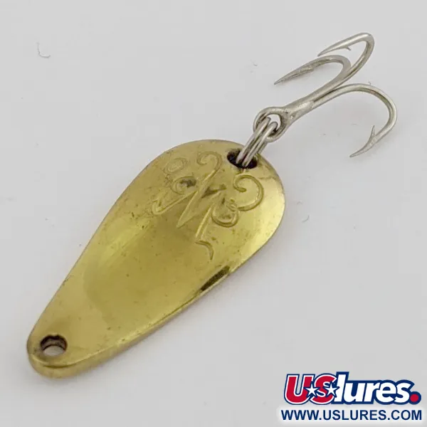 Штампована літера «W» декоративним шрифтом на опуклому боці ідентифікує цю коливальну блешню вагою 1/8 унції (3,5 г) як справжню Weller Gypsy King Deluxe. Компактне тіло у формі краплі має довжину 1 дюйм (2,7 см) і вирізняється теплим латунним покриттям, яке залишається яскравим і блискучим. У каталозі під кодом 24521, ця металева приманка демонструє точне штампування та гладкі краї, характерні для американських снастей середини минулого століття. Один трійник закріплений безпосередньо в задньому отворі суцільнометалевого корпусу. Цей конкретний екземпляр має оцінку стану 5/5, без суттєвого зносу полірованих поверхонь або гравіювання.