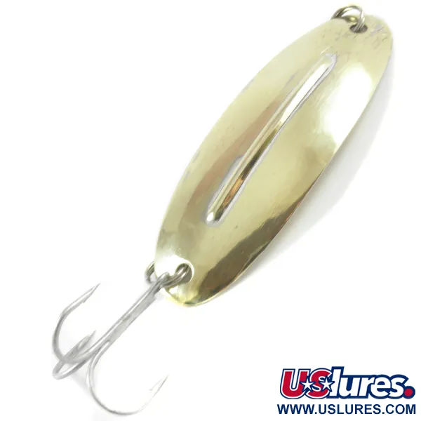 У центрі цієї класичної канадської конструкції проходить виразне стабілізуюче ребро, яке допомагає підтримувати стабільну гру на різних швидкостях проводки. Ця модель Williams Wabler W50 (артикул 3112) має дзеркальне золоте покриття, яке зберегло більшу частину свого первісного блиску. Завдяки довжині 6,7 см (2 3/4") та вазі 14 г (1/2 oz), ця блешня є універсальним розміром для лову щуки або судака. На зворотному боці приманки розміщене штамповане маркування виробника, включаючи напис «Made in Canada». Конструкція блешні залишається міцною, хоча на металевій поверхні помітні незначні сліди тривалого зберігання, що відповідає оцінці стану 4/5. Оснащення складається з надійного трійника на заводному кільці у хвостовій частині, а додаткове заводне кільце в носовій частині забезпечує надійне кріплення до вашої снасті.