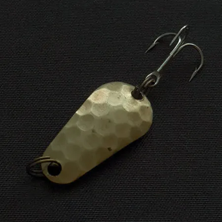 На гладкому латунному звороті блешні чітко вибито класичну назву, що визначає цю приманку вже протягом десятиліть. Кована фактура на опуклому боці створює багатогранну поверхню, яка відбиває світло в різних напрямках. Ця модель Acme Wob-L-Rite під артикулом 20363 має довжину тіла 1 дюйм (2,5 см) та важить 1/8 унції (3,5 г). Блешня виготовлена в США з цільної латуні, яка має яскраве рівномірне покриття по всьому краплеподібному профілю. Фурнітура оригінальна: приманка оснащена двома заводними кільцями та трійником у вінтажному стилі. Стан оцінюється на 5/5: металева поверхня та глибоке гравіювання збереглися у відмінному стані. Вона створена для точних закидів, особливо при лові форелі чи окуня на невеликих водоймах, де потрібна приманка з компактним металевим профілем. Конструкція втілює традиційну металообробку, де щільність латуні забезпечує необхідну дальність закидання попри малий розмір.