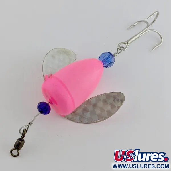 Яскраво-рожевий пінопластовий корпус є основою цього 11-сантиметрового (4 1/4") Worden's Spin-n-Glo, розробленого Yakima Bait спеціально для дрифтового лову. Два сріблясті крильця в клітинку обертаються на течії, вони розташовані між гранованими синіми намистинами на центральній осі. Ця модель (артикул 24451) важить 1/4 унції (8 г) і оснащена заводським трійником та вертлюгом для запобігання закручуванню волосіні. Стан приманки оцінюється на 5/5, флуоресцентне покриття та світловідбивальні візерунки на крилах ідеально збережені. Плавучість корпусу піднімає приманку в зону атаки, а обертові крильця створюють чіткий візуальний акцент у воді.