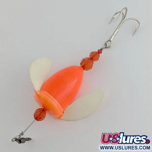 Яскраво-помаранчевий плаваючий корпус цього дрифт-спіннера з крильцями поєднується з напівпрозорими білими лопатями, розробленими для обертання на течії. Маючи вагу 1/4 унції (8 г) та загальну довжину 4 1/4" (11 см), цей Yakima Bait Worden's Spin-n-Glo оснащений на дротяній осі з червоними гранованими намистинами, що створюють тонкий візуальний акцент. Конструкція включає класичний трійник на кінці, корисний для річкової ловлі, де важливо тримати оснастку над дном. Занесений до каталогу під кодом товару 24452, оснащення та покриття залишаються у відмінному стані, що відповідає рейтингу 5/5. Потік води активує крильця навколо нерухомого корпусу під час дрейфу або повільного тролінгу.