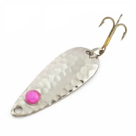 Карбована текстура нікелевої поверхні визначає цю блешню довжиною 1 3/4" (4,5 см), що відбиває світло під різними кутами завдяки заглибленням на корпусі. Чітка рожева прямокутна смужка розміщена на внутрішній стороні для додаткової помітності. Цей екземпляр з артикулом #24573 важить 3/16 унції (6 г) і доповнений маленькою рожевою намистиною біля заднього вушка. Покриття металу яскраве та зберігає високу відбивну здатність, стан оцінюється як 5/5. Традиційна форма «крапля» звужується до місця кріплення трійника.