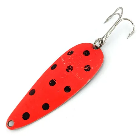 Чорні цятки на яскраво-червоному фоні роблять цю коливну блешню Worth Chippewa Steel вагою 14 г (1/2 унції) справжньою окрасою будь-якої колекції снастей середини минулого століття. Ця американська блешня завдовжки 7 см (2 3/4"), завдяки своїй міцній конструкції та уловистим забарвленням, була обов’язковим елементом у коробках рибалок США у другій половині XX століття. Даний екземпляр з каталожним номером 13972 має блискучий нікельований зворотний бік, що створює чіткий металевий контраст із пофарбованою лицьовою стороною. Приманка оснащена великим трійником на міцному заводному кільці, а отвір для кріплення жилки акуратно виштампуваний у звуженій носовій частині. Цікаво, що червоний пігмент помітно світиться під дією ультрафіолету, а в умовах слабкого освітлення набуває глибокого оранжево-червоного відтінку. Маючи лише ледь помітні сліди використання, блешня зберіглася у відмінному стані (оцінка 4 з 5). Товста сталь дозволяє приманці стабільно тримати гру під час глибинної проводки або під час тролінгу з човна.