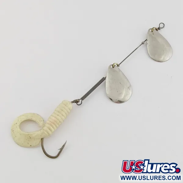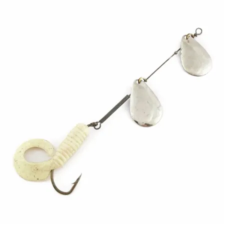 Вертушка оснащена двома нікельованими пелюстками у формі краплі, які забезпечують постійне виблискування під час рівномірної проводки. При загальній довжині 13 см (5") ця оснастка важить 5 г (3/16 унції), що робить її чудовим вибором для лову на легку снасть або тролінгу в прісних водоймах. Нікелеве покриття пелюсток поєднується з білим твістером, прикрашеним дрібними сріблястими блискітками для додаткової привабливості. Червоні намистини-атрактори на дротяному каркасі забезпечують правильну дистанцію між пелюстками та створюють точку атаки біля дужок. Одинарний гачок оснащений ребристим м'яким пластиковим хвостом, надійно закріпленим на каркасі за допомогою міцної дротяної петлі. Виробник Worth виготовив ці компоненти з простим вушком у носовій частині для прямого прив'язування жилки або використання невеликої застібки. Загальний стан оцінюється як 5/5: чисті металеві поверхні та еластичний пластиковий хвіст. Ця конфігурація під артикулом 24502 демонструє модульність класичних конструкцій обертових блешень.