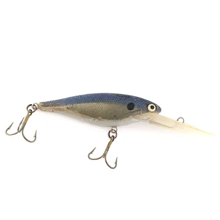 Yo-Zuri Crankin Shad TMB завдовжки 3 дюйми (7,5 см) — це бувалий на воді глибоководний воблер у класичному японському дизайні. Цей екземпляр вагою 11 г (2/5 унції) має забарвлення під луску в синьо-сріблястих тонах, яке доповнює виразна темна пляма біля зябрової кришки. Велика прозора лопать дозволяє йому заглиблюватися на 2–3 м (6,5–10 футів) при закиданні, тоді як під час тролінгу він може йти на глибині до 5 м (16 футів). Оснащення складається з трійників, на яких помітні сліди використання в минулих сезонах, що відповідає загальному стану 3/5. Синьо-фіолетова спинка плавно переходить у фактурний малюнок луски на боках, а завершують вигляд жовті очі з темними зіницями. Кожен аспект конструкції свідчить про високі стандарти якості японських снастей Yo-Zuri серії Hardcore & Bass.