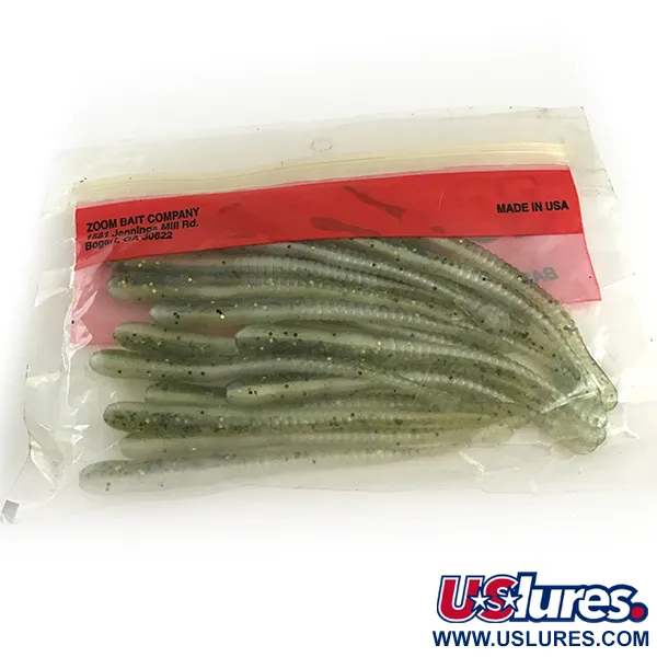 Маючи довжину рівно 4 дюйми (10 см), ці стрункі силіконові приманки є базовим вибором для любителів делікатної ловлі, що потребують непомітної презентації. У цій конкретній упаковці Zoom Meathead (артикул 6667, маркування 024-114) представлене легендарне забарвлення Baby Bass — напівпрозора зелена основа з великою кількістю темних та блискучих зелених блискіток. Хоча на оригінальній упаковці вказано 20 штук, цей вінтажний набір містить 19 невикористаних приманок, що зберегли свою початкову текстуру та вигляд. Виготовлені в США, ці приманки мають ребристе тіло, що переходить у тонкий плоский хвіст; таку форму часто обирають для оснасток дроп-шот або спліт-шот. Приманки перебувають у новому стані й виглядають так, ніби їх щойно зняли з полиці рибальського магазину десятки років тому. Кожен черв’як виготовлений за формулою «Better Than Salt», вказаною на класичному червоно-жовтому хедері компанії Zoom Bait.
